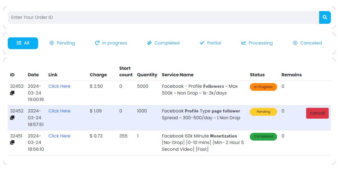 Third after you have balance in your account , so now you can place orders in form , see step by step . you can check “https://www.fxsmmpanel.com/services” to see all service and price.